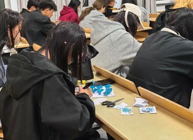 活动期间,社团精心准备彩纸、画笔、丝带、贴纸等丰富材料,设置温馨的创作区域。活动现场,同学们热情高涨,纷纷化身“设计师”,有的认真勾勒校园风景,将与老师相处的难忘场景融入画中;有的用心书写暖心话语,把平日里未说出口的感谢凝练成文字;还有的巧妙搭配装饰元素,用丝带、干花为贺卡增添精致感。从构图、上色到写字、封装,每一个步骤都饱含心意,一张张普通的卡纸在大家手中变成独一无二的“感恩信物”。