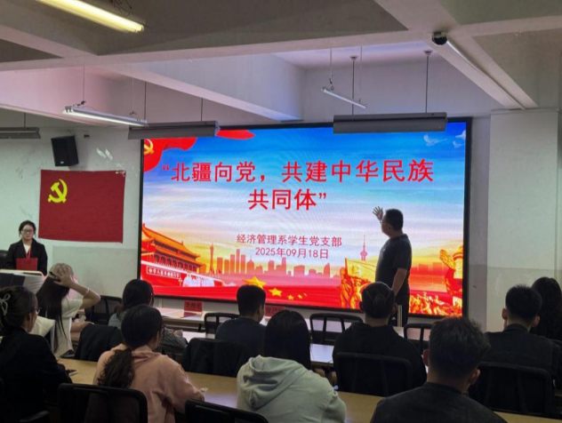 9月18日,经济管理系于实验楼402举办“北疆向党,共筑中华民族共同体”主题研讨学习活动。在经济管理系教学秘书李海星、辅导员张己炳的指导下,同学们系统学习北疆地区多民族共生的历史背景与现实意义,进一步理解中华民族共同体的深刻内涵。活动现场交流热烈,同学们踊跃发言。