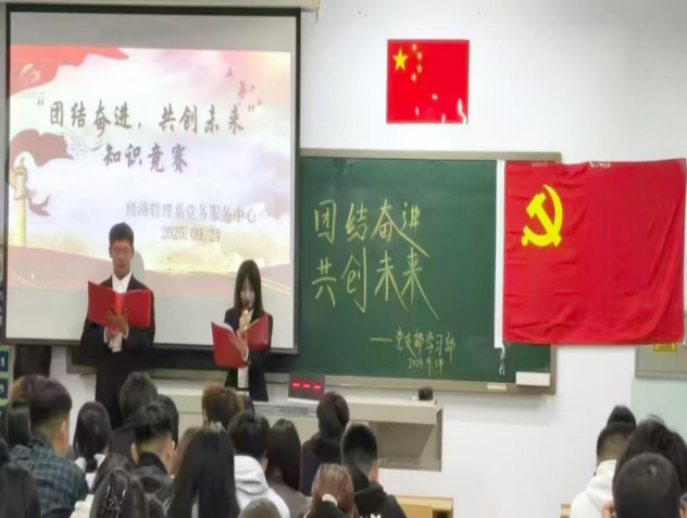 9月24日,经济管理系于教学楼A104举办“团结奋进,共创未来”主题知识竞赛。竞赛设置必答题、抢答题、风险题等环节,内容兼具知识性与趣味性,全面考验选手的综合能力与团队协作精神。各代表队配合默契、踊跃作答,展现出良好的精神风貌和扎实的知识基础。