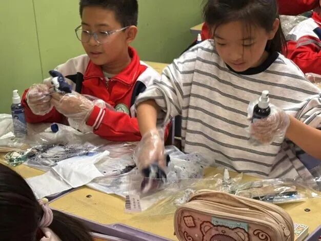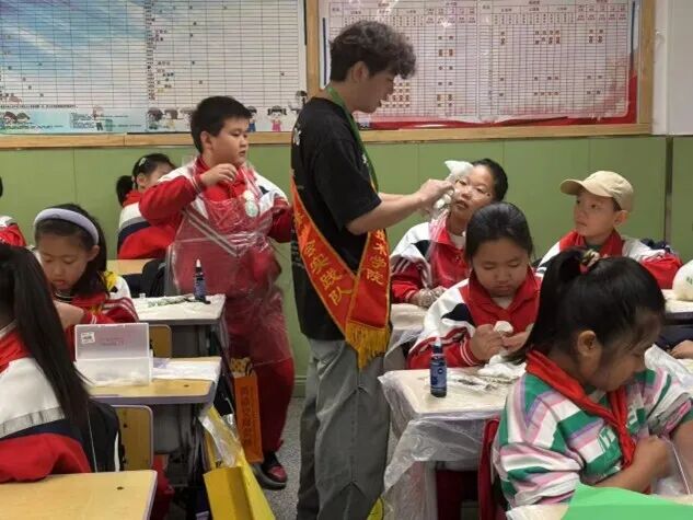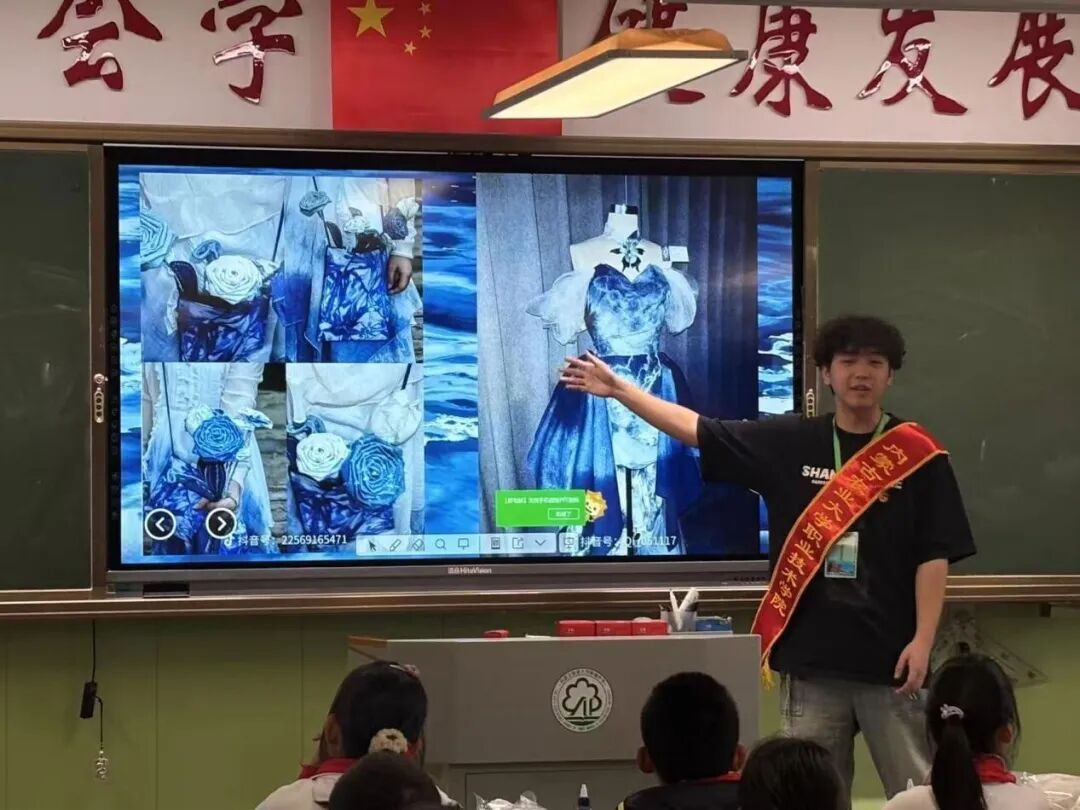 学生志愿者用图文并茂的方式为同学们讲解扎染的历史源流、传统纹样的文化寓意以及核心工序,孩子们也大胆尝试折叠、打结、捆扎,用皮筋勾勒出星星、花朵、波浪等创意图案。当浸满染料的布料被逐一展开,原本素净的白布变成一件件充满个性的扎染作品,孩子们举着自己的“杰作”欢呼雀跃,在动手实践中真切感受非遗的匠心与魅力。