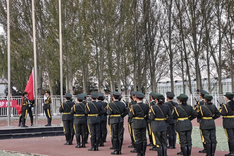国旗护卫队的脚步声是校园晨光中最庄严的序曲,唤醒每一颗年轻的心。他们身着笔挺的军装,帽檐下目光坚毅如炬,映照着五星红旗的鲜红。每一步铿锵都踏响理想的节拍,每一次驻足都定格信念的模样,为师生们上着最生动的爱国主义一课,让信仰的力量在校园中久久激荡。