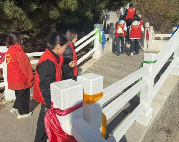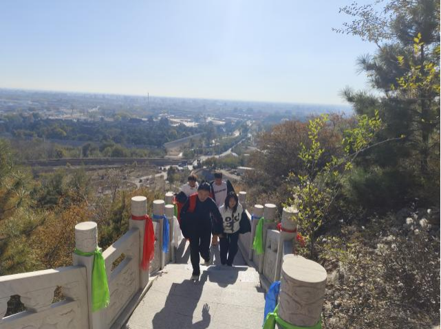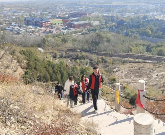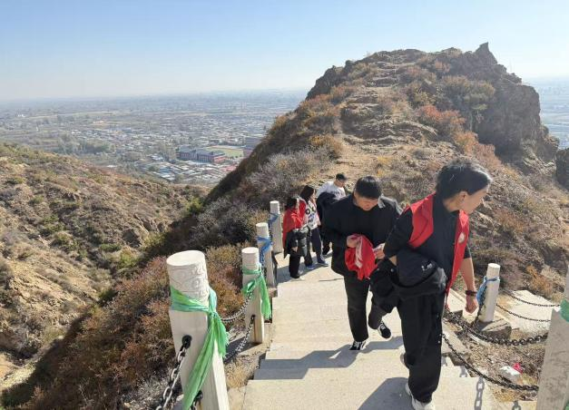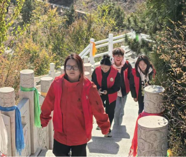 活动当天,参与活动的师生们一同前往美岱召景区登山步道。登山过程中,师生们彼此照应,分享登山技巧与重阳习俗典故。史娜老师还结合园林专业知识,为学生讲解沿途植被特征与生态保护要点,让志愿服务与专业学习有机融合,用脚步丈量责任,用陪伴传递温情。
