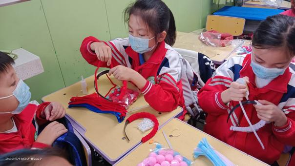 志愿者们结合图文资料,用生动易懂的语言介绍凤冠在古代礼仪中的重要地位,以及其上镶嵌的珠宝、刺绣纹样所蕴含的吉祥象征,还提前准备好卡纸、彩绳、亮片、胶水等材料,指导小朋友们裁剪、粘贴、装饰,小朋友们发挥想象力,用手中的材料制作出独一无二的“迷你凤冠”,脸上洋溢着满满的成就感。