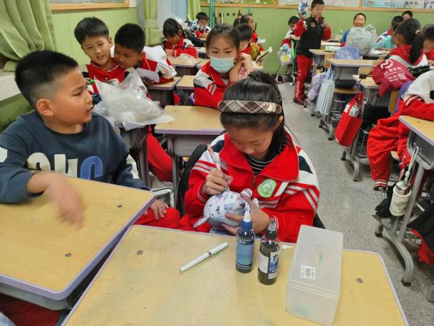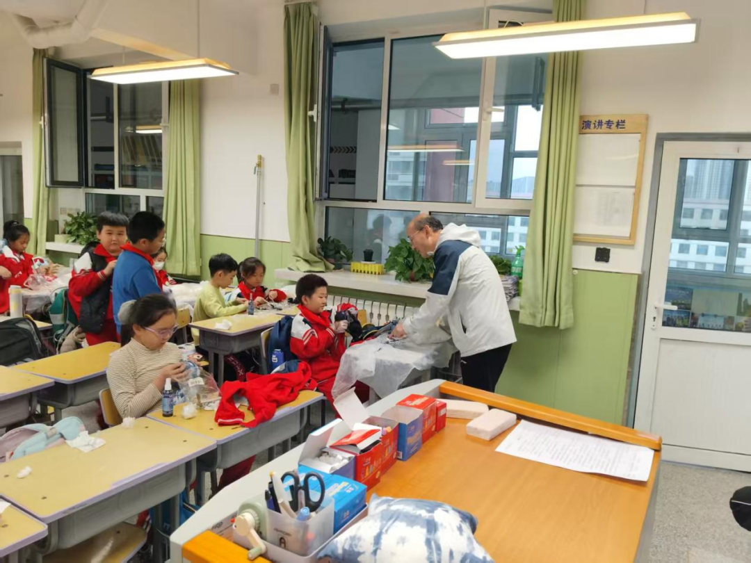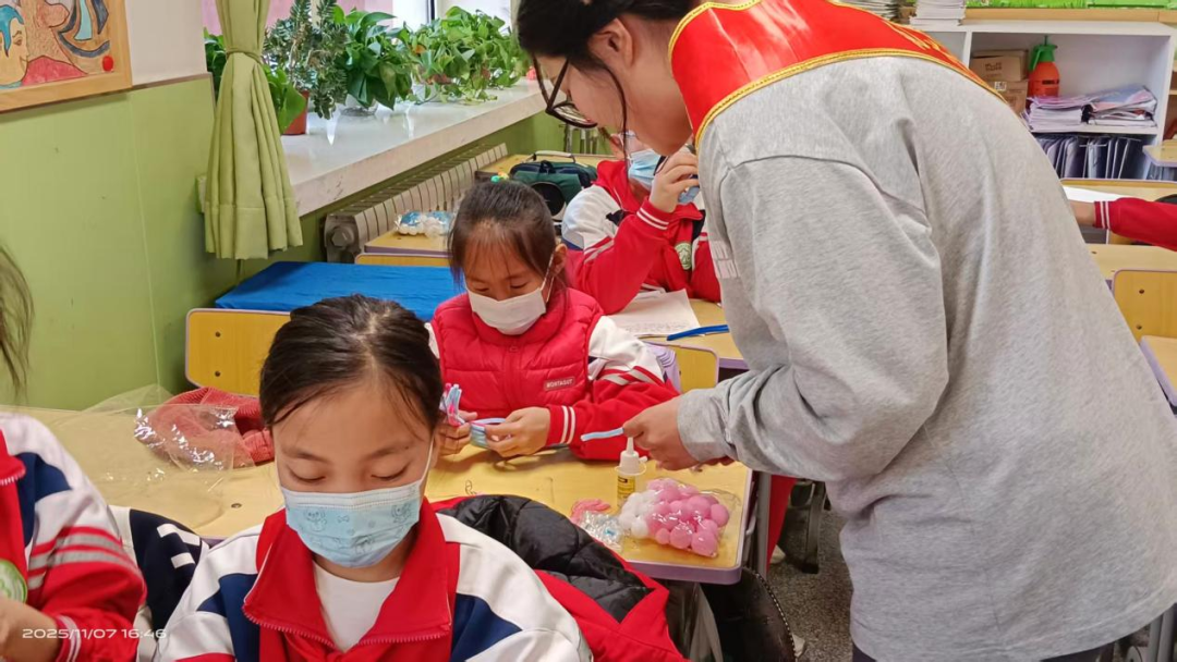 志愿者们为小朋友们讲解扎染的历史渊源、地域特色及文化内涵,郗福兵书记亲自示范操作技巧,鼓励小朋友们大胆发挥想象力,尝试不同的捆扎手法。小朋友们认真学习步骤,将白布变成形态各异的“小包裹”,看着自己亲手制作的扎染作品,小朋友们脸上满是喜悦与自豪。
