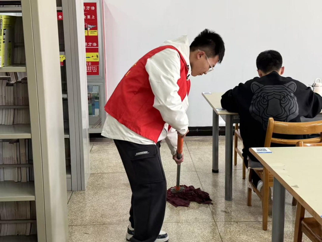 活动当天,志愿者们有的整理书屋书架上错落的书籍,将散放的文学经典、科普读物等分类归置;有的轻拭书脊上的浮尘,为磨损的书籍贴上防护标签;有的手持抹布细致擦拭书屋的桌椅、窗台与书架边缘,将积尘逐一拭去;还有的拿起扫帚和簸箕,轻扫角落堆积的纸屑与杂物。志愿者们以切实行动传递优化阅读环境的青春担当与服务热忱,为书屋整洁舒适筑牢基础。