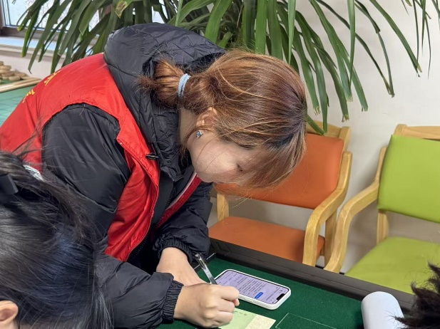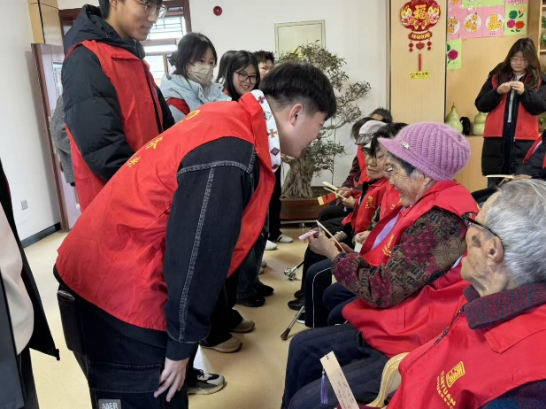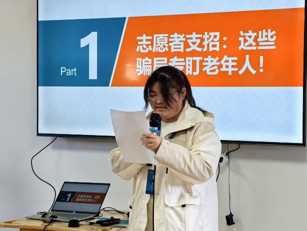 志愿者们首先来到天源康养中心,他们结合案例,用通俗语言讲解保健品虚假宣传等老年常见骗局,拆解骗子话术,又通过互动提问引导老人思考防诈方法,并发放防诈小贴士的明信片,叮嘱老人们要认清骗局套路,帮助老人掌握防骗技巧。