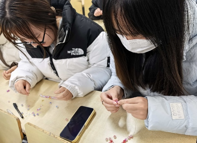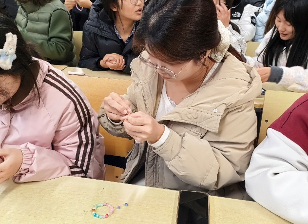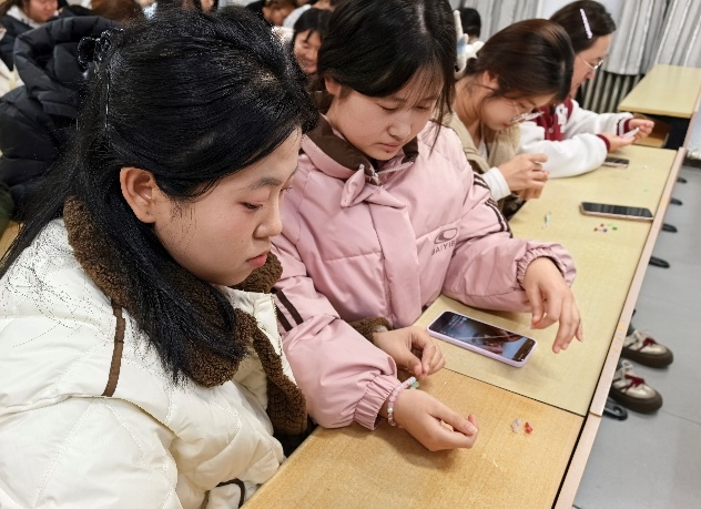 活动现场化身为充满创意的手作工坊,同学们在琳琅满目的珠串与编织材料中自由挑选,专注地投入手链制作。彩色丝线在指尖缠绕穿梭,晶莹的珠子被巧妙地编织成各具特色的手链。大家不时交流编织心得,分享配色灵感,在协作互动中提升手工技巧。一条条精致的手链逐渐成型,既是创意的结晶,更是情感与心意的温暖传递。
