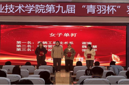 车辆工程技术系谢瑜荣获女子单打第一名、旅游管理系魏家慧荣获女子单打第二名、艺术设计系张思宇荣获女子单打第三名。