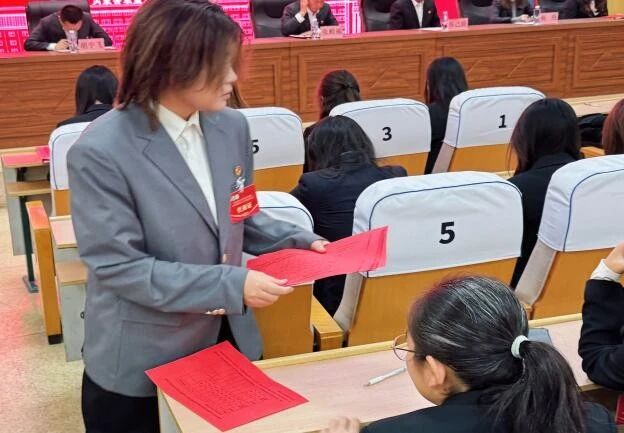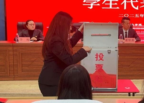工作人员宣读第二十七届学生会主席团成员及第十三次学生代表大会常任代表候选人名单及简介,并在详细解读大会选举办法后现场当众检验票箱并加封,确保选举过程公开透明。随后,工作人员有序发放选票,在场学生代表秉持公平公正原则,依次投出选票。纪盈旭同学公布大会选举结果,新一届学生会主席团成员及常任代表正式产生,现场响起热烈掌声。