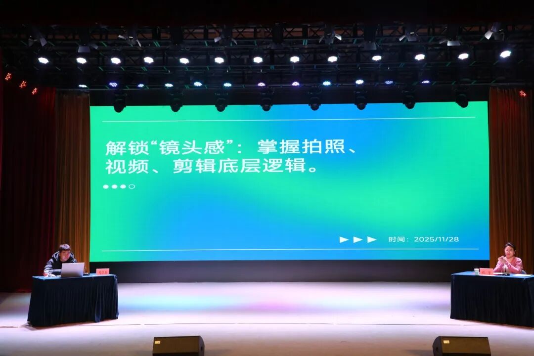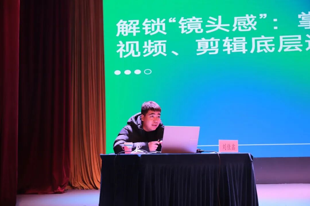 为深入贯彻落实习近平总书记关于建设全媒体传播体系的重要指示精神,进一步提升学院师生的媒介素养与视觉表达能力,11月28日,学院于礼堂举办“解锁‘镜头感’:掌握拍照、视频、剪辑底层逻辑”主题讲座。主讲嘉宾为著名导演、音乐人刘佳鑫,学院团委张宇老师主持讲座,各系(院)辅导员老师出席活动。