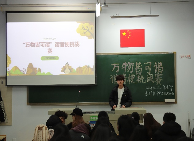 为传承中华语言文字魅力,落实文化育人与素质教育融合要求,引导学生感受汉语谐音趣味、增强传统文化认同感与创新表达能力,11月27日,由学院团委社团管理部主办、中华传统文化社团承办的“万物皆可谐”谐音梗主题挑战赛在教学楼A103举办。