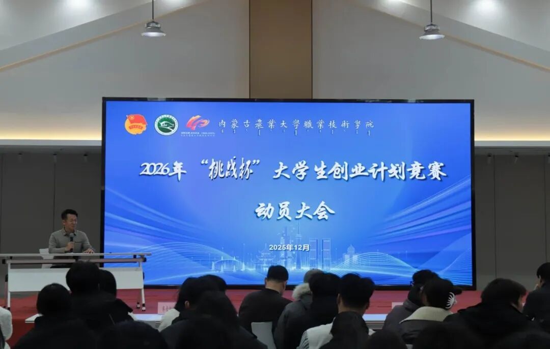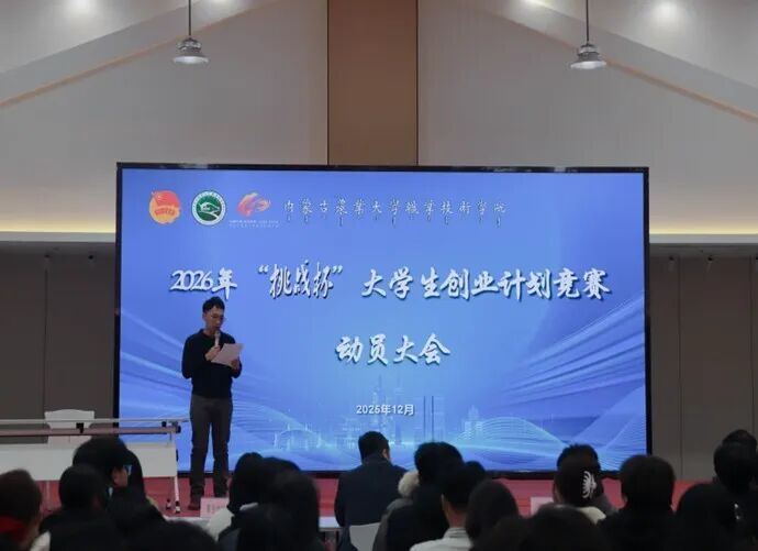为深入贯彻落实国家创新创业教育政策,激发青年学生创新思维与创业热情,助力培养高素质复合型人才,12月4日,学院于“一站式”学生服务中心举办2026年“挑战杯”大学生创业计划竞赛动员大会。内蒙古额尔敦实业(集团)股份有限公司总裁解嵘、上德投资咨询管理有限公司董事长张云飞、国家一级创业导师刘利国以及各系相关老师出席活动。大会由学院团委书记董智勇主持。