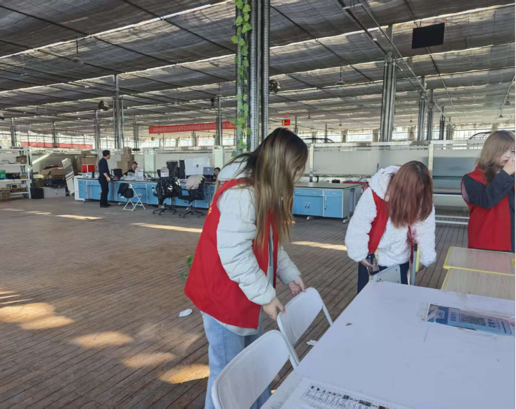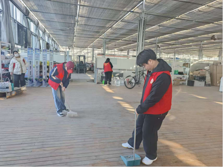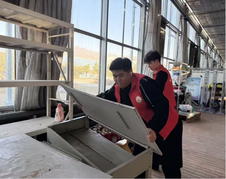 志愿者们携带清扫工具有序进入园区温室大棚。大家分工明确,有的清理杂草,有的擦拭种植器具,有的规整园艺材料,在劳动中展现出高涨的热情与默契地配合。尽管园区温室大棚内工作环境较为繁琐,但同学们不畏辛苦,仔细清理每一个角落,让实训园区温室大棚的面貌焕然一新。
