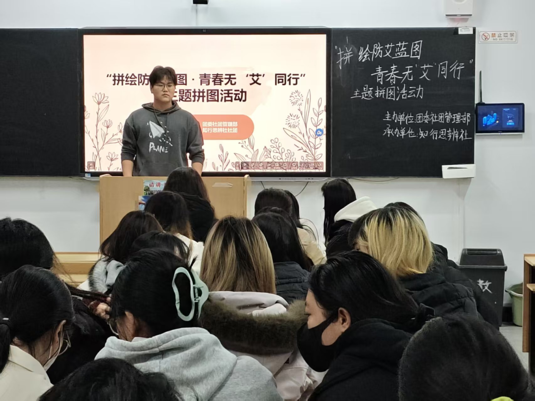 为贯彻落实国家艾滋病防治工作方针,响应“健康中国”战略与校园防艾教育部署,引导学生在趣味互动中学习防艾知识、树立科学防护理念与责任意识,12月7日,由学院团委社团管理部主办、知行思辨社承办的“拼绘防艾蓝图 青春无‘艾’同行”主题拼图活动于教学楼A207教室举办。