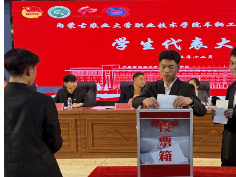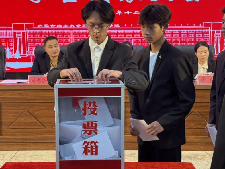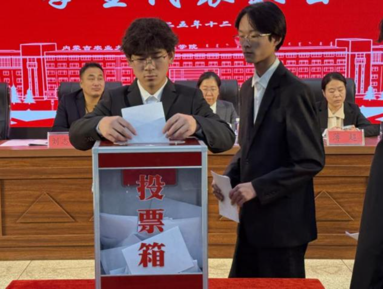 主持人宣读第十六届学生会主席团成员及第六次学生代表大会常任代表候选人名单及简介,详细解读大会选举办法,现场当众检验票箱并加封,确保选举过程公开透明。工作人员有序发放选票,在场学生代表秉持公平公正原则,依次投出选票。薛璐同学公布大会选举结果,新一届学生会主席团成员及常任代表正式产生,现场响起热烈掌声。