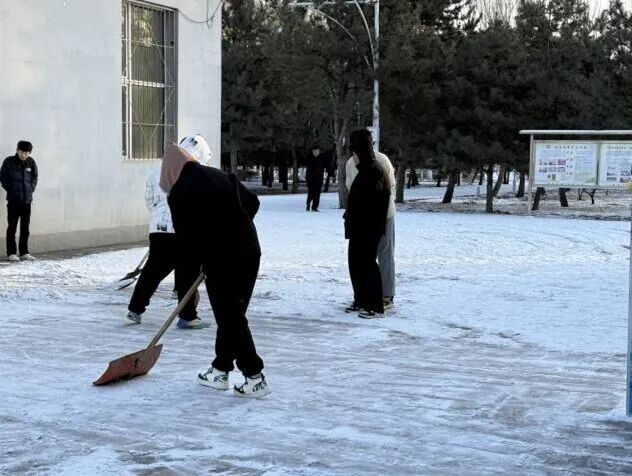 志愿者们携带铁锹、扫帚等工具迅速集结、分工协作,重点对实训车间出入口、实训场地主干道、操作台周边及实训车辆停放区域进行积雪清理,寒风中挥舞工具的身影穿梭在实训基地各处,默契配合、互帮互助,用实干驱散严寒。