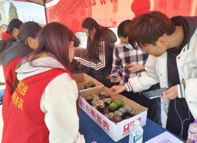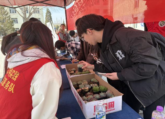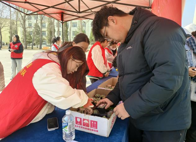 活动现场氛围热烈而有序,工作人员详细讲解绿植养护知识、生态环保理念与低碳生活方式,引导同学们了解植物生长习性、掌握科学养护方法。领养之后,大家纷纷与绿植合影,用镜头定格春日里的青春与生机。志愿者们身着红色马甲,穿梭在人群中维持秩序、答疑解惑,成为活动现场一道温暖的风景线。