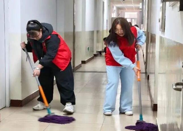 志愿者们秉持不怕脏、不怕累的奉献精神,有序开展清洁工作,进行全方位清扫与擦拭,细致清理各类垃圾杂物,规范整理公共区域物品,每一个环节都认真细致、一丝不苟。经过志愿者们的共同努力,宿舍公共区域的环境面貌焕然一新,卫生状况得到显著改善。