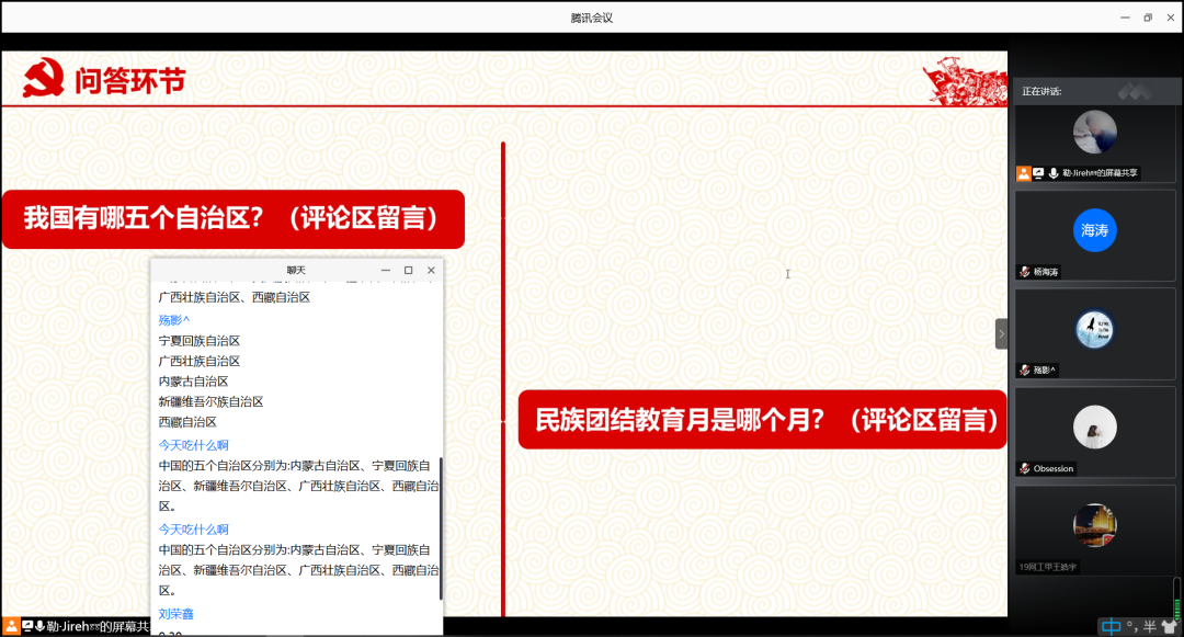 近日,我院计算机技术与信息管理系组织各班开展了以“铸牢中华民族共同体意识”为主题的线上主题团日活动。各班班主任共同参与其中,活动中同学们就铸牢中华民族共同体意识的意义和路径进行了学习。