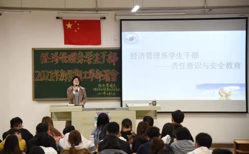 在会上,五位学生干部负责人依次上台发言,围绕过去的一学期中出现的问题进行了自我总结与批评,并对本学期即将开展的工作进行了详细的部署安排。同时,刘莎老师向经济管理系学生做了新学期安全教育培训,强调了在做好疫情防控工作的同时要提高防火、防电等安全意识。